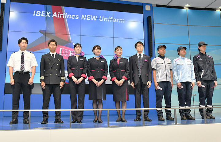 新制服をお披露目するIBEXのスタッフ。(左から)パイロット2人、女性CA3人、男性CAの制服を着用する社員、整備士=25年8月7日 PHOTO: Yusuke KOHASE/Aviation Wire