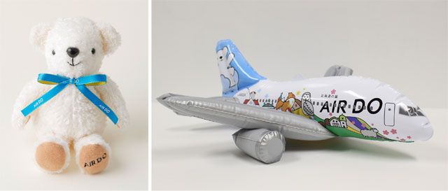 就航当日は、各路線の銘菓と同社のオリジナルグッズをプレゼント。オリジナルグッズは、同社のマスコットキャラクター「ベア・ドゥ」のぬいぐるみ(Sサイズ)、特別塗装機「ベア・ドゥ北海道JET」のビニールプレーン(大)を用意する。