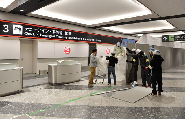新千歳空港でJALの新カウンターの仮囲いを外す作業員=16年12月12日午後9時22分 PHOTO: Tadayuki YOSHIKAWA/Aviation Wire