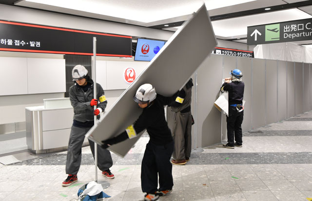 新千歳空港でJALの新カウンターの仮囲いを外す作業員=16年12月12日 PHOTO: Tadayuki YOSHIKAWA/Aviation Wire