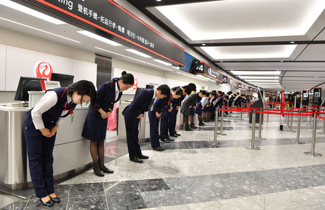 午前6時30分にオープンする新千歳空港の新カウンター前で一礼するJALの地上係員=16年12月13日午前6時29分 PHOTO: Tadayuki YOSHIKAWA/Aviation Wire