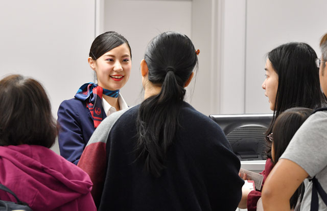 ターミナル南側に設けられた新カウンターは、JALの搭乗手続きがどこで行えるのかや、乗客が自分がすべき手続きのカウンターがどこなのか、進むべき保安検査場がどこにあるかを、わかりやすく案内することに主眼が置かれた。