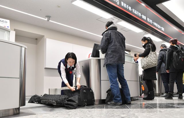 フラット化された重量計にスーツケースを載せるJALの地上係員=16年12月13日 PHOTO: Tadayuki YOSHIKAWA/Aviation Wire