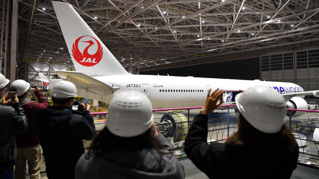 格納庫を出る777-300ERを撮影する参加者=16年12月22日 PHOTO: Tadayuki YOSHIKAWA/Aviation Wire