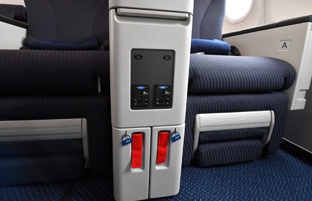 ANAのA320neo初号機ビジネスクラスの電源コンセント=16年12月26日 PHOTO: Tadayuki YOSHIKAWA/Aviation Wire