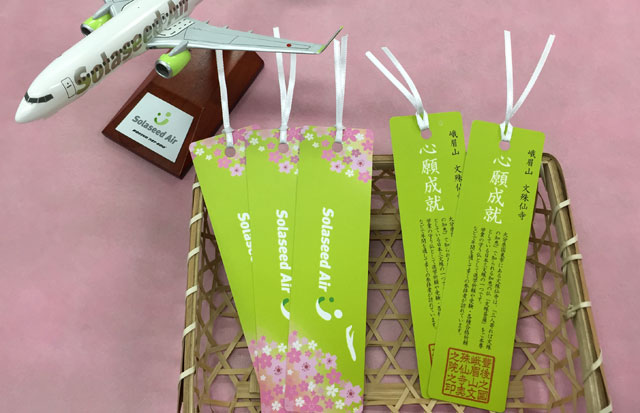 文殊仙寺で祈祷を受けたソラシドエアの社員による手作りしおり(同社提供)