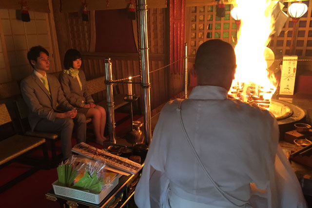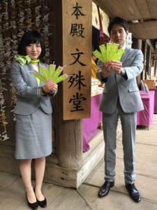 文殊仙寺で祈祷を受ける手作りしおりとソラシドエアの地上係員(同社提供)