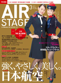 月刊エアステージ(イカロス出版)の2017年3月号が、1月28日発売。1300円(税込)。表紙は日本航空(JAL/JL、9201)のキャビンアテンダント、中山真理子さん(右)と新海雅さん。