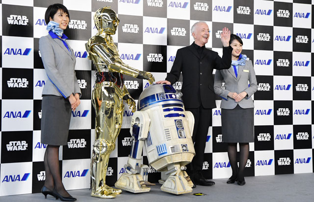 C-3PO(左から2人目)やR2-D2(同3人目)、ANAの客室乗務員と記念撮影に応じるアンソニー・ダニエルズさん=17年3月20日 PHOTO: Tadayuki YOSHIKAWA/Aviation Wire