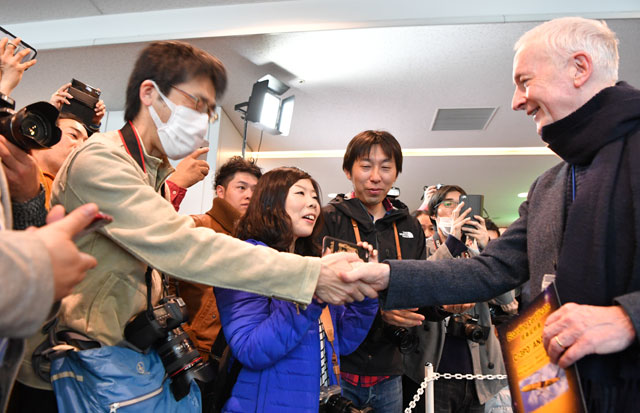 C-3POジェット初便となった羽田発鹿児島行きNH621便の乗客の求めに応じて写真に収まるアンソニー・ダニエルズさん=17年3月21日 PHOTO: Tadayuki YOSHIKAWA/Aviation Wire