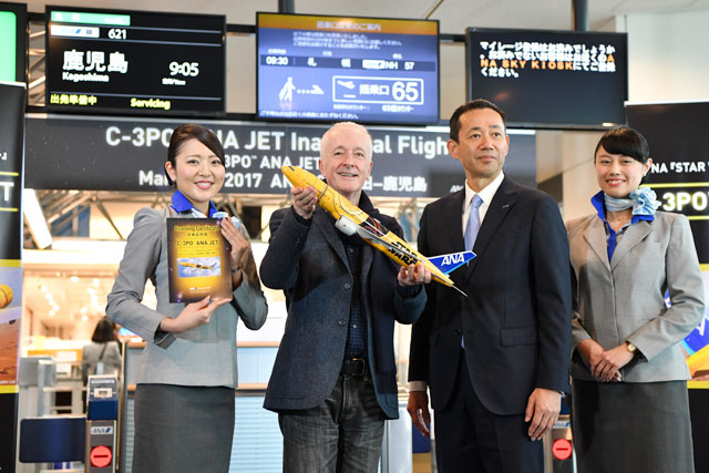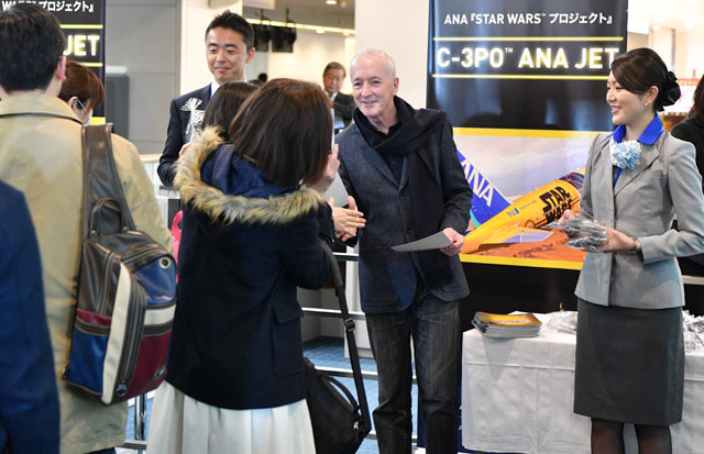 初便の出発前に羽田でセレモニーが開かれ、C-3PO役の俳優、アンソニー・ダニエルズさんがサプライズで登場。乗客と記念撮影に応じるなど、交流を深めていた。また、初便の乗客1人には、ダニエルズさんのサインが入ったC-3POジェットの模型がプレゼントされた。