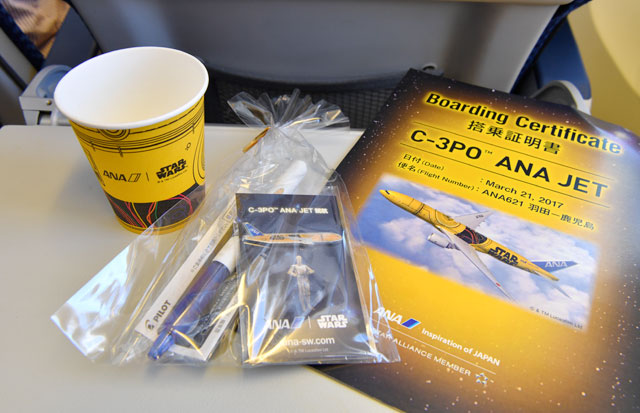 C-3POジェット初便となった羽田発鹿児島行きNH621便の乗客に配られた初便搭乗証明書(右)と記念品、機内で飲み物を提供する際に使う紙コップ=17年3月21日 PHOTO: Tadayuki YOSHIKAWA/Aviation Wire