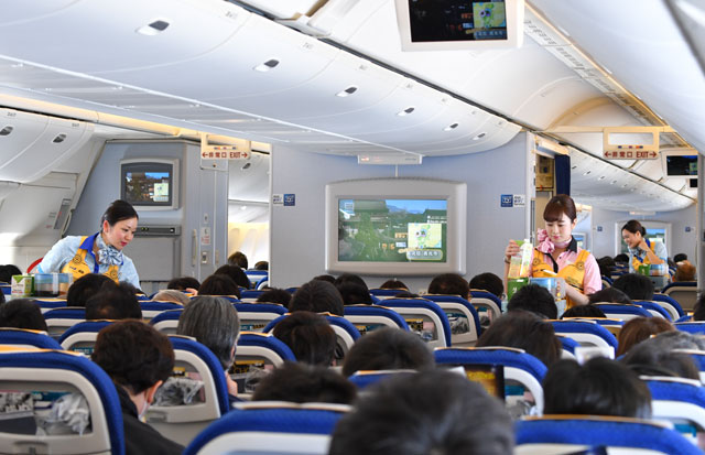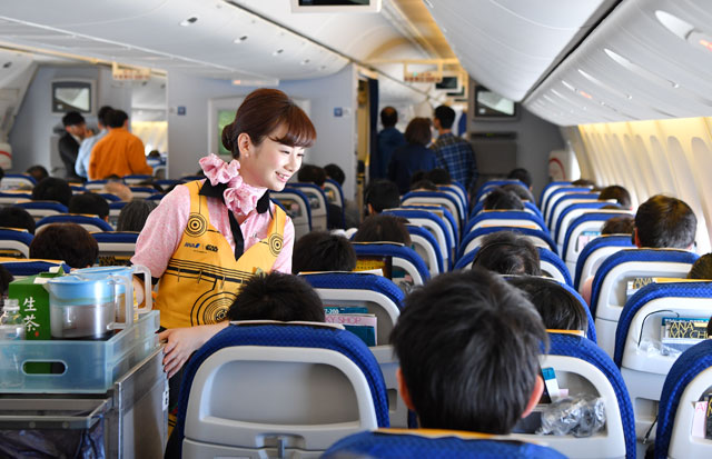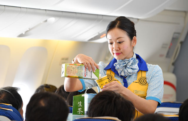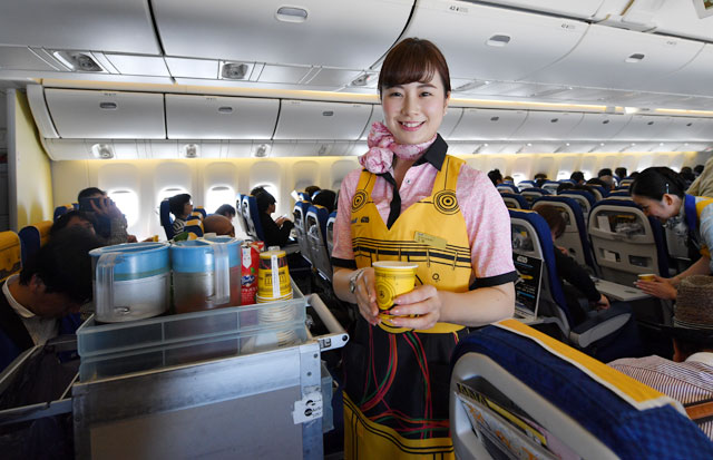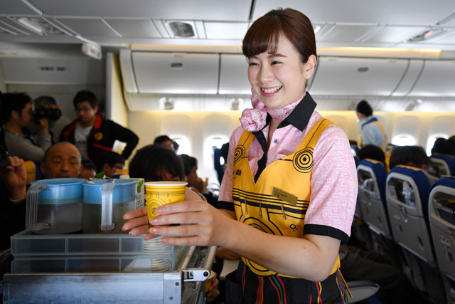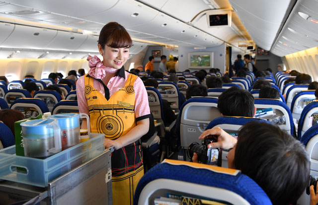 C-3POジェットで黄色いエプロンを着用して機内サービスするANAの客室乗務員=17年3月21日 PHOTO: Tadayuki YOSHIKAWA/Aviation Wire