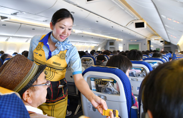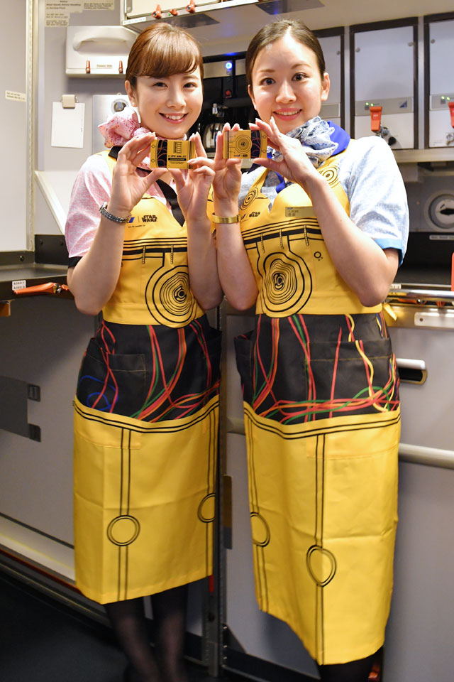C-3POをイメージした黄色いエプロンを着用して機内サービスするANAの客室乗務員=17年3月21日 PHOTO: Tadayuki YOSHIKAWA/Aviation Wire