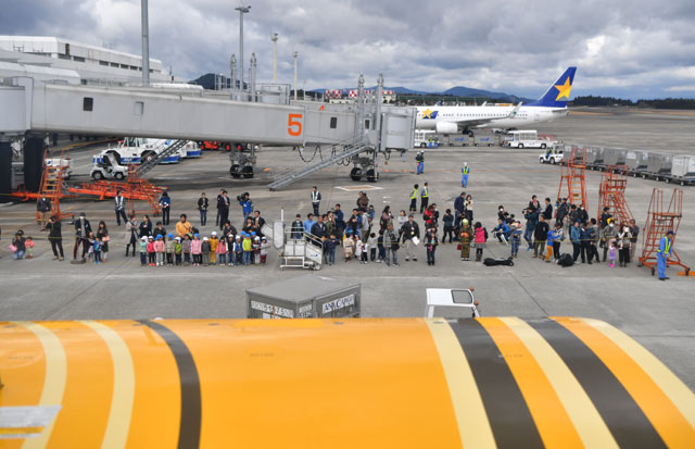 鹿児島空港でC-3POジェットの初便を出迎える保育園児ら=17年3月21日 PHOTO: Tadayuki YOSHIKAWA/Aviation Wire