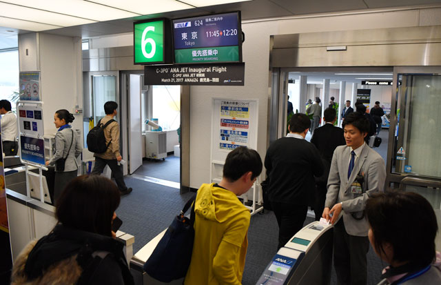 鹿児島空港でC-3POジェットによる羽田行きNH624便に搭乗する乗客=17年3月21日 PHOTO: Tadayuki YOSHIKAWA/Aviation Wire