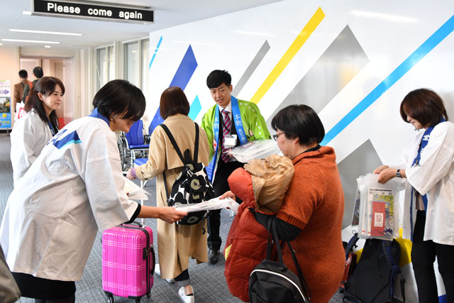 鹿児島空港でC-3POジェットによる羽田行きNH624便に搭乗する乗客に記念品を手渡すANAの社員=17年3月21日 PHOTO: Tadayuki YOSHIKAWA/Aviation Wire