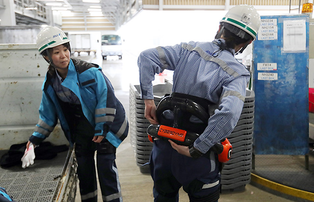 試験導入するのはサイバーダインのロボットスーツ「HAL作業支援用(腰タイプ)」で、これまでの2台から25台に増やす。2018年3月31日まで、重量物の運搬時に腰への負担軽減や生産性向上などを検証する。