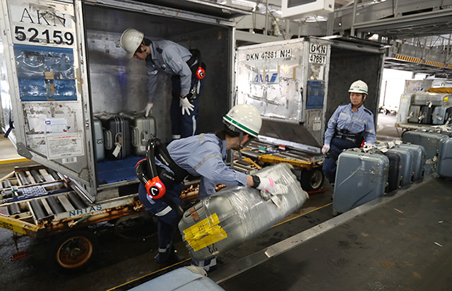 HALを装着し受託手荷物を積み込むANAのグラハンスタッフ=17年3月27日 PHOTO: Yoshikazu TSUNO/Aviation Wire