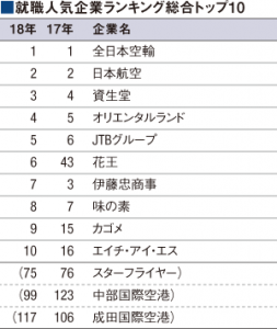 就職情報を取り扱う学情(2301)は、2018年に卒業・修了見込みの学生を対象とした就職人気企業のランキングを3月29日に発表した。総合ランキングでは全日本空輸(ANA/NH)が1位、日本航空(JAL/JL、9201)が2位にランクインした。