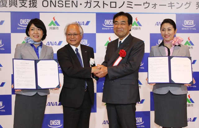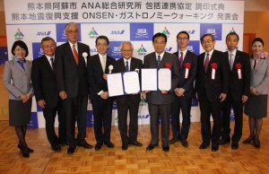 都内で開かれた包括連携協定の調印式で協定書を手にするANA総研の岡田社長(中央左)と阿蘇市の佐藤市長(同右)ら=17年4月21日 PHOTO: Youichi KOKUBO/Aviation Wire