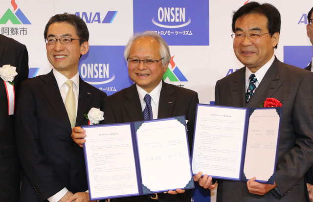 都内で開かれた包括連携協定の調印式で協定書を手にするANA総研の岡田晃社長(中央)と阿蘇市の佐藤義興市長(右)、列席したANAの平子裕志社長(左)=17年4月21日 PHOTO: Youichi KOKUBO/Aviation Wire