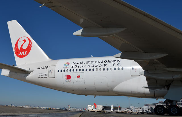 2020年夏季五輪の東京招致活動に協賛している日本航空(JAL、9201)は11月21日、招致ロゴとスローガンを機体後部に描いた特別塗装機を国内線に就航させた。