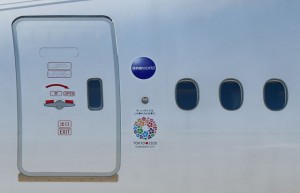 今回の特別塗装機には機体後部のほかにドアの横にも招致ロゴが貼ってあり、同じものを全機に貼る予定。