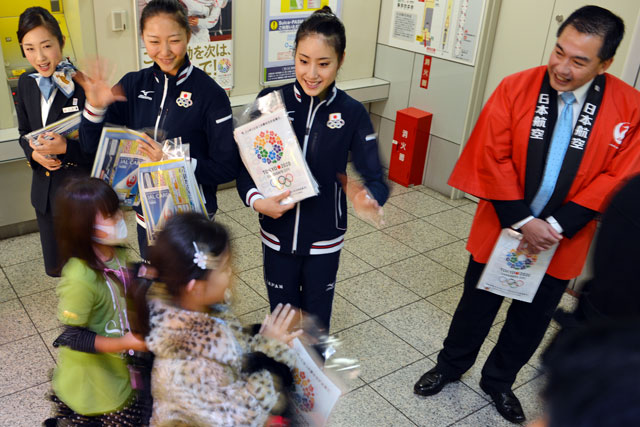 正午すぎからは東京モノレールの羽田空港第1ビル駅で、JALの大西賢会長や運航乗務員、客室乗務員、整備士らとともに、ロンドン五輪で新体操団体7位に入賞した田中琴乃選手と松原梨恵選手、サイード横田仁奈選手、深瀬菜月選手、畠山愛理選手、三浦莉奈選手の日本代表6選手も乗客らに招致活動をPRした。