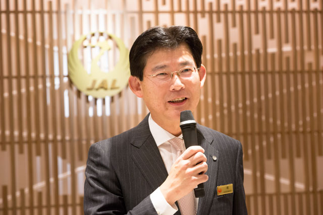 福岡空港ダイヤモンド・プレミアラウンジについて説明するJALの柏頼之執行役員=17年3月28日 PHOTO: Tatsuyuki TAYAMA/Aviation Wire