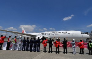 羽田でこいのぼりフライト旭川行きJL553便を見送るJAL社員=17年5月5日 PHOTO: Tadayuki YOSHIKAWA/Aviation Wire