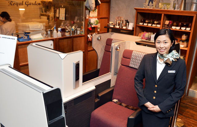 ロイヤルガーデンカフェ青山の店内で体験できるJALビジネスクラスの新シート=11月22日 PHOTO: Tadayuki YOSHIKAWA/Aviation Wire