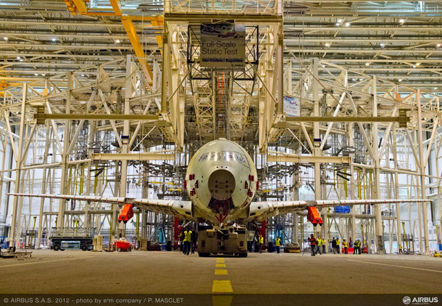 静的構造試験を行う施設に移動したA350 XWB=12年11月 PHOTO: P. Masclet, em company/Airbus