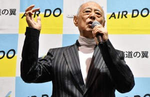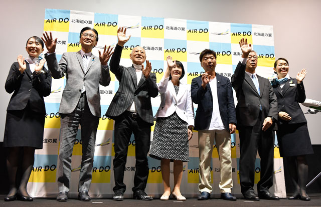 エア・ドゥが協賛する映画『生きとし生けるもの』の舞台挨拶に登壇する今津監督(右から3人目)と誘い人の津川さん(左から3人目)と(左2人目から)古屋氏、高橋知事、谷社長、両脇は客室乗務員=17年5月23日 PHOTO: Tadayuki YOSHIKAWA/Aviation Wire