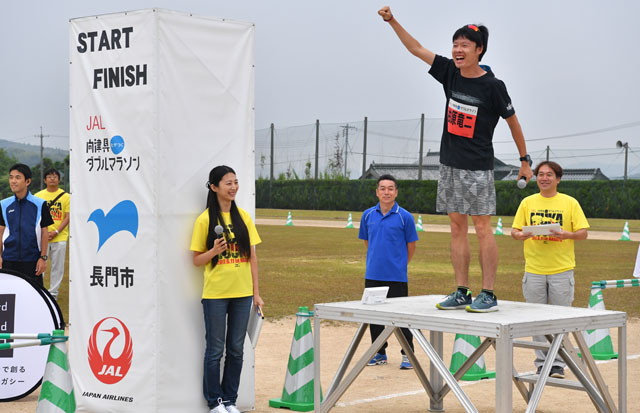 JALむかつくマラソンのスタート前にあいさつするゲストランナーの柏原竜二さん=17年6月11日 PHOTO: Tadayuki YOSHIKAWA/Aviation Wire
