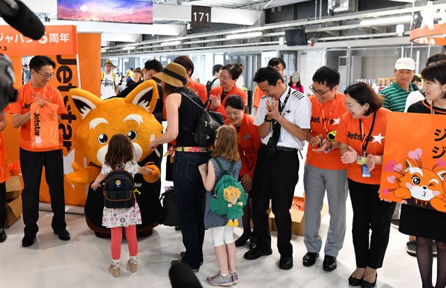 ジェットスター・ジャパン(JJP/GK)は7月3日、就航5周年を迎えた。成田空港では記念セレモニーが開かれ、片岡優会長やジェリー・ターナーCEO(最高経営責任者)らが札幌行きGK111便の乗客164人(幼児2人含む)を出迎え、記念品がプレゼントされた。