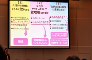 メンバーたちは、女性が管理職を目指す上で壁となるもののうち、コミュニケーション不足解消に向けて、社員同士が話し合う場を朝に設ける「朝活」や、女性が管理職にやりがいを感じてもらうためのパネルディスカッション、仕事と介護を両立するために重要となる、社員の知識向上や周囲の理解向上に向けた取り組みを進めてきた。