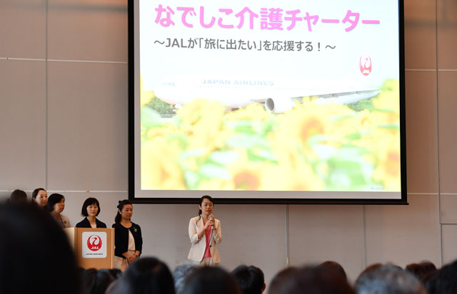 JALなでしこラボ第2期研究発表会で「なでしこ介護チャーター」の構想を発表するチーム「TAKE OFF」のメンバー=17年7月6日 PHOTO: Tadayuki YOSHIKAWA/Aviation Wire