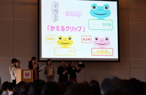 なでしこラボ第2期研究発表会で定時退社が進むよう「かえるクリップ」を提案するチーム「360」のメンバー=17年7月6日 PHOTO: Tadayuki YOSHIKAWA/Aviation Wire