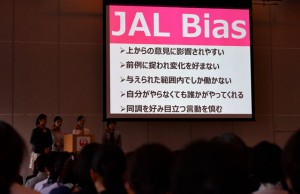 なでしこラボ第2期研究発表会で自己成長するための課題として「JALバイアス」を挙げるチーム「虹の架け橋」のメンバー=17年7月6日 PHOTO: Tadayuki YOSHIKAWA/Aviation Wire