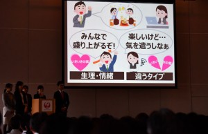 なでしこラボ第2期研究発表会でモチベーションが高まる要素「いきいきの素」が人それぞれ異なる点を説明するチーム「ドーナツの穴」のメンバー=17年7月6日 PHOTO: Tadayuki YOSHIKAWA/Aviation Wire