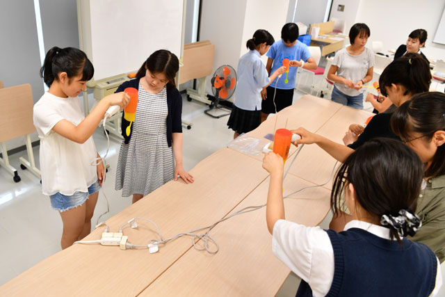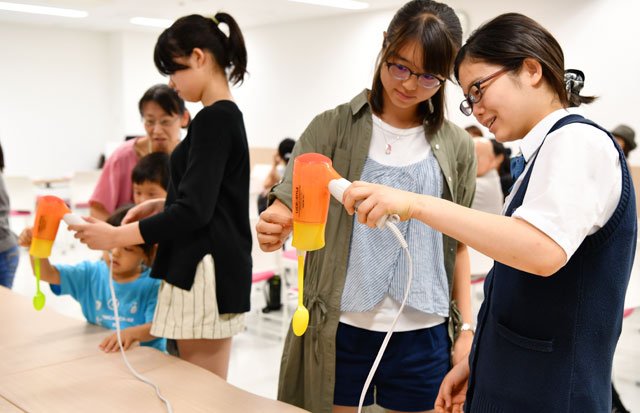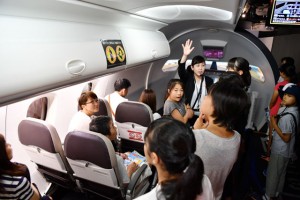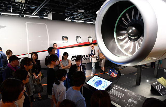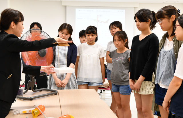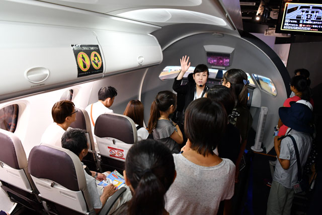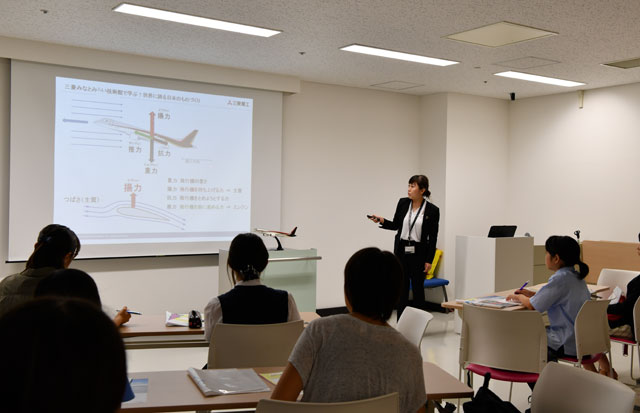 イベントでは、航空機が飛ぶ仕組みをはじめ、機体の大きさや重さがどのくらいあるのかといった講義が開かれた後、扇風機やドライヤー、スプーン、アクリル板を使い、機体が浮く揚力の実験などが行われた。その後は、同館の「航空宇宙ゾーン」に展示している国産初のジェット旅客機「MRJ」のモックアップ(実物大模型)を見学した。