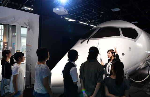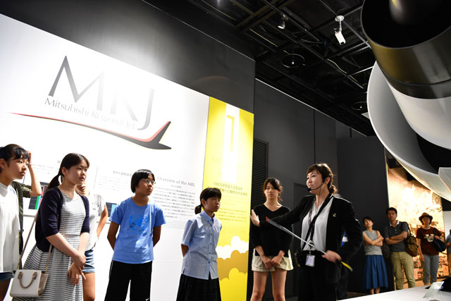 MRJのモックアップについて女子中学生に説明する三菱みなとみらい技術館の佐野さん(右)=17年7月17日 PHOTO: Tadayuki YOSHIKAWA/Aviation Wire