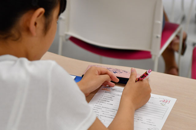 講義後にアンケート用紙に記入する女子中学生=17年7月17日 PHOTO: Tadayuki YOSHIKAWA/Aviation Wire