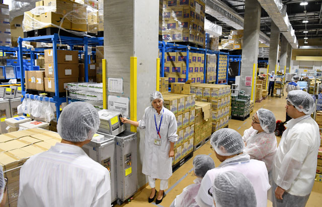 参加者は試食前に工場内を見学。機内に搭載する酒類や食料品を保管する保税倉庫をはじめ、厳しい衛生管理が行われている施設内を見学した。
