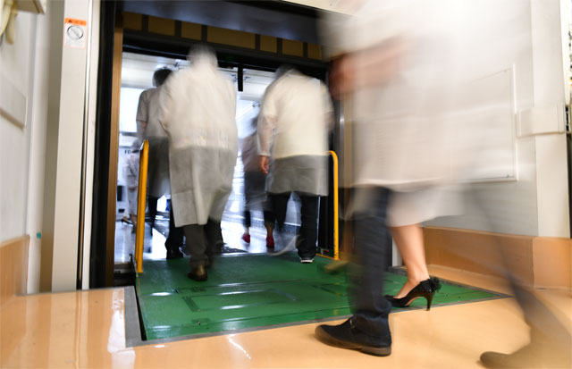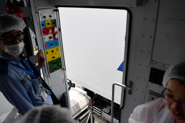 参加者を乗せたFD車の荷室にある扉を係員が開けると、地上からの高さに驚きの声が上がった。FD車の荷室は工場2階から1階まで下がり、見学を終えた参加者は試食会場に向かった。