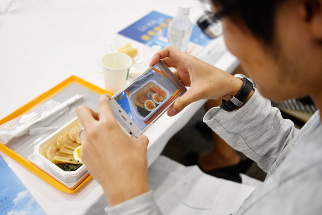 和食の新作「鶏出汁ご飯 チャーシューのせ」をスマートフォンで撮影する参加者の小橋さん=17年7月29日 PHOTO: Tadayuki YOSHIKAWA/Aviation Wire