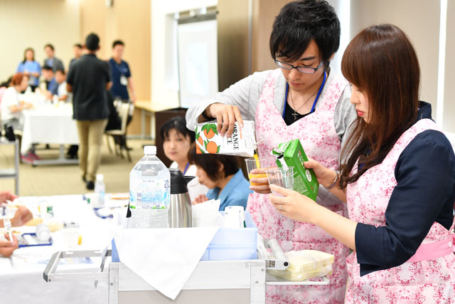 ANAの機内食試食会で客室乗務員のエプロンをしてお茶をサービスする参加者の小橋さん(右から2人目)=17年7月29日 PHOTO: Tadayuki YOSHIKAWA/Aviation Wire