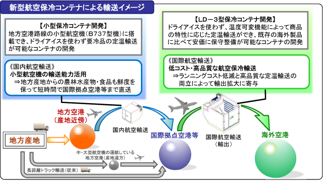 現在、地方から農林水産物や食品を航空便で輸出する場合、国内線で使用するボーイング737型機に対応する航空保冷コンテナがないため、最寄りの国際拠点空港などにトラックで輸送している。海外向けの航空保冷コンテナは、ドライアイスの冷気を