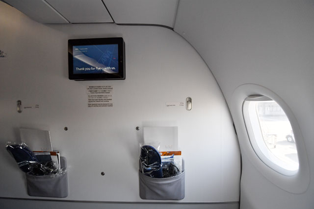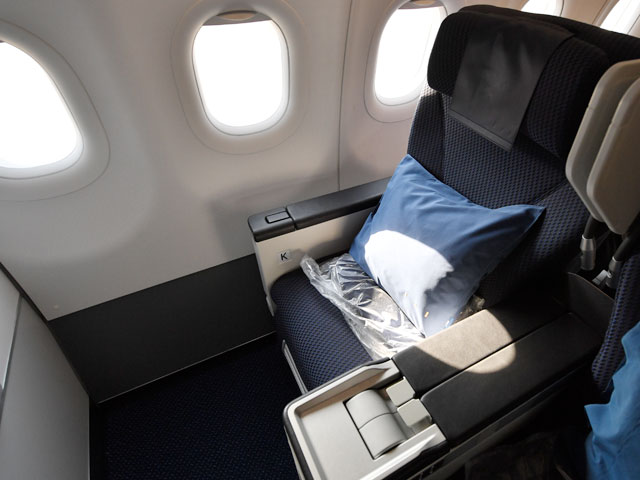 レカロ社の1世代前のシートを採用しているA321ceoのプレミアムクラスもそうだったが、いつまでも座っていたいと思うくつろげるシートで、短距離国際線にはちょうど良い座り心地だ。777などに採用されている、現行プレミアムクラスの革張りシートのようにお尻がすべることもない。